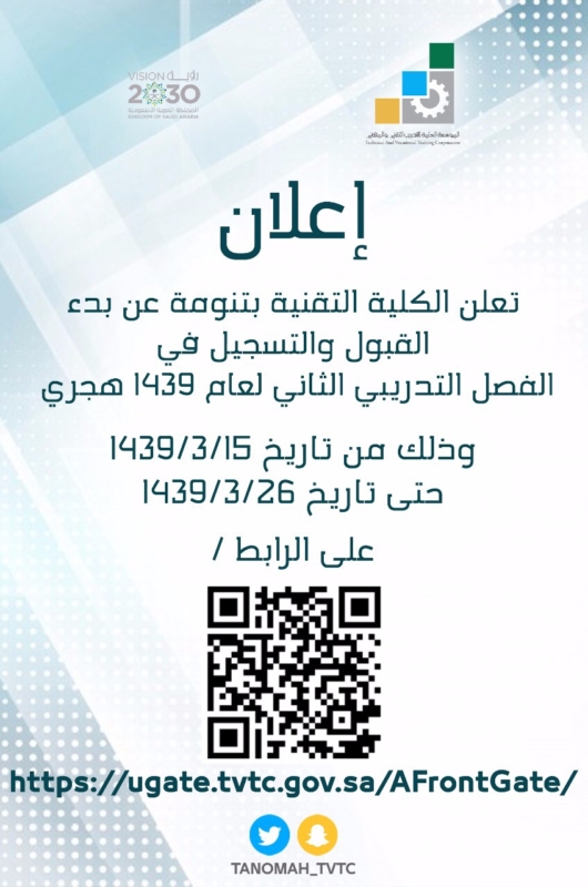 كلية التقنية القبول والتسجيل 1439 أعلنت المؤسسة العامة للتدريب التقني والمهني عن رابط تقديم الكلية التقنية عبر بوابة القبول الموحد الإلكترونية للبنين والبنات الفصل التدريبي الثاني مع توضيح دليل القبول في. القبول بالكلية التقنية بجازان 1437 كلية التقنية بجازان عمر عريبي سبق جازان. حددت الكلية التقنية بجازان العاشر من الشهر الجاري موعدا لفتح باب التسجيل للفصل التدريبي الأول للعام التدريبي 1433 1434هـ ولمدة ثلاثة أسابيع وذلك عبر موقع المؤسسة العامة للتدريب التقني والمهني urlwww tvtc gov sa.