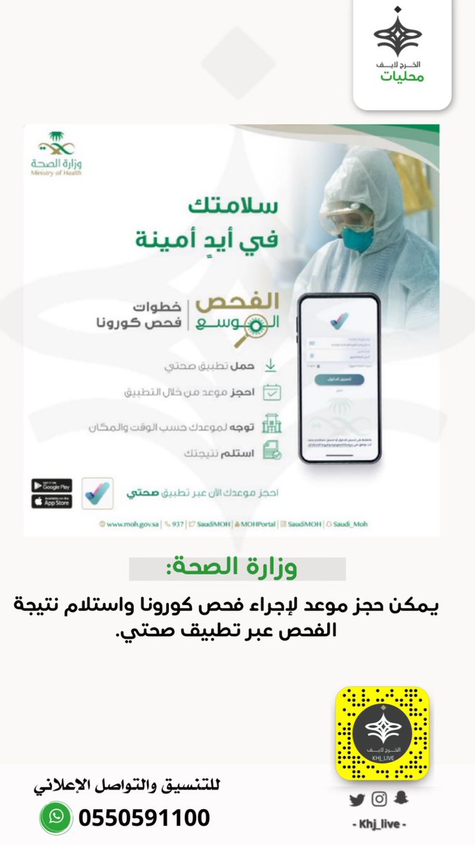 وزارة الصحة تعلن حالات الإصابة والوفاة الجديدة. كشفت وزارة الصحة اليوم الجمعة عن تسجيل 433 إصابة جديدة بفيروس كورونا المستجد كوفيد 19 في المملكة وبهذه الحصيلة يرتفع العدد الإجمالي للإصابات إلى 341495 فيما بلغ إجمالي حالات التعافي حتى الآن نحو 327795 وبينما وصل. حجز موعد لفحص فايروس كورونا covid 19. تطبيق صحتي يقدم بإشراف وزارة الصحة في المملكة العربية السعودية امتدادا لـ رسالتها في تطوير مستويات الرعاية الصحية المقدمة وخدماتها.