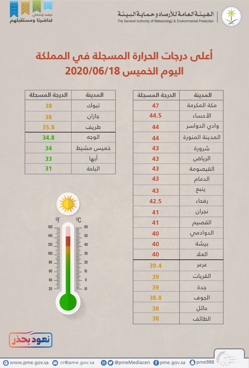 درجة الحرارة في مكة الان. في مكة المكرمة يسود طقس صحو وتصل درجة الحرارة العظمى إلى 42 مئوية ونسبة رطوبة 60 وفي عرفات فتبلغ درجة الحرارة 42 مئوية ونسبة رطوبة 65. سيكون الطقس ليلا صافيا وتكون درجة الحرارة الصغرى 27 م وهي مشابهة لليلة أمس. شاهد الجو اليوم في ساحة الحرم المكي مباشرة duration.
