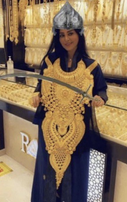 ونشرت ريم عبد الله صورة لها عبر تويتر وهى ترتدي طقم رعد الشمال وهو قلادة كبيرة من الذهب يبلغ وزنها 4 كيلو و200 جرام بينما يبلغ سعره 1 4 مليون ريال.