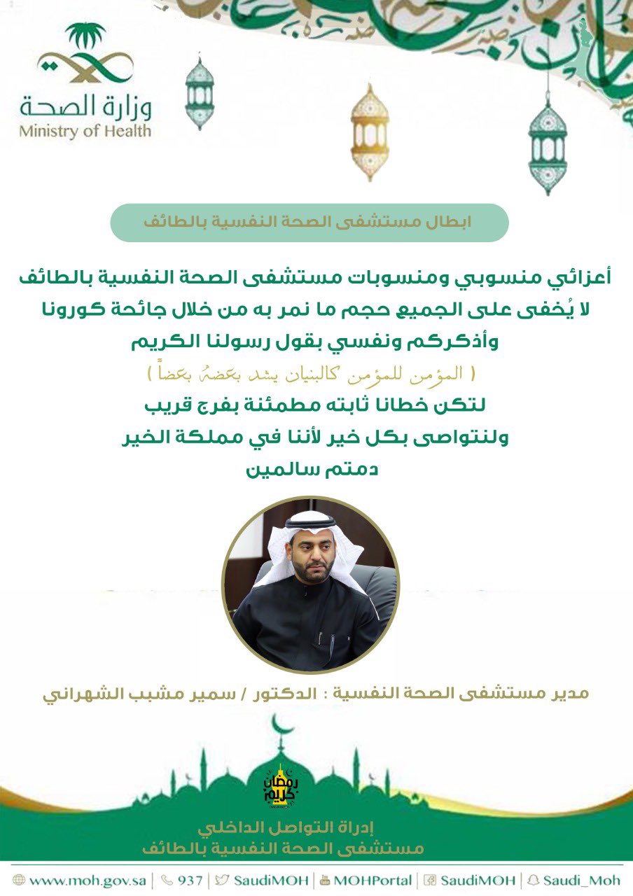 احتفلت إدارة ومنسوبو مستشفى الصحة النفسية بالطائف بشفاء آخر نزلاء المستشفى بعد إصابته بفيروس كورونا ومغادرته لجناح العزل إلى جناح التنويم العادي. تقع مستشفى شهار في الطائف 26513 المملكة العربية السعودية بإعتبارها أكبر مستشفى للأمراض النفسية في الطائف. مستشفى الصحة النفسية بالطائف يعمل على زيادة عدد الأسر ة. حس ن مستشفى الصحة النفسية بالطائف من الخدمات المقدمة للمراجعين والنزلاء من خلال تنفيذ مشروعين في قسمي المختبر والطوارئ.